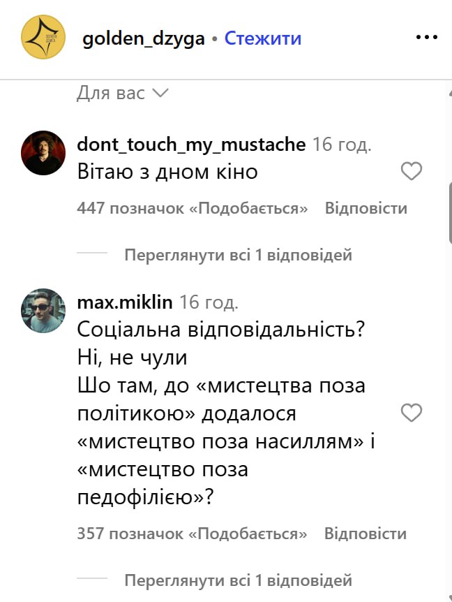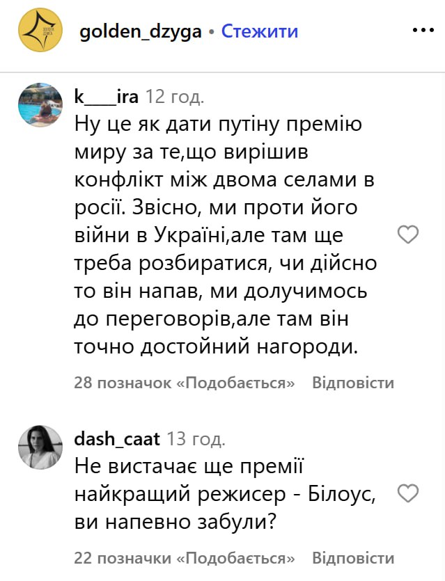 Сразу после объявления результатов национальной кинопремии "Золота дзиґа" соцсети наполнили гневные комментарии в адрес Темляка. Пользователи писали, что подобная награда выглядит как "индульгенция на насилие".