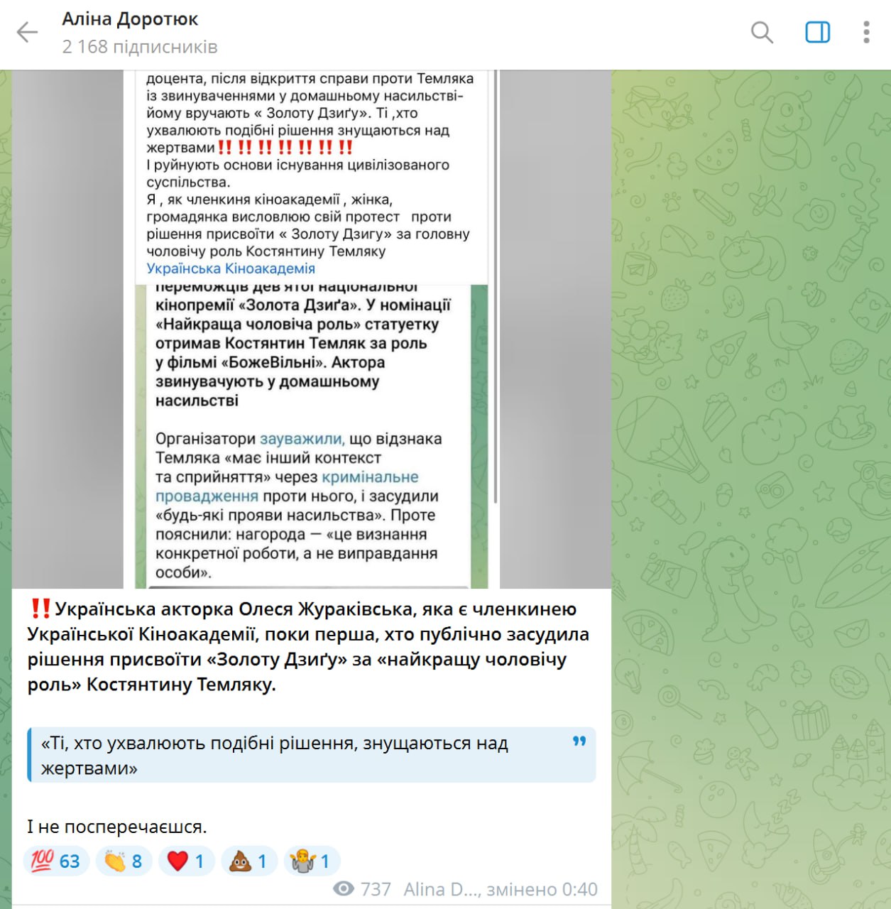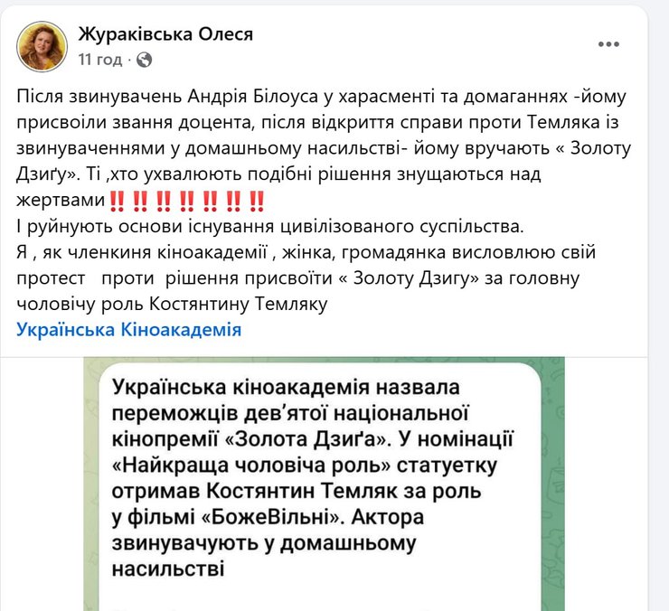 "Я, как член киноакадемии, женщина и гражданка, выражаю протест против решения присвоить "Золоту дзиґу" Константину Темляку", — написала она в Facebook.