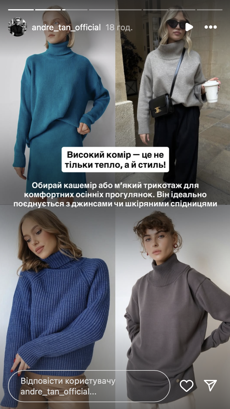 "Все мы обожаем свитера, и вот уже совсем скоро придет похолодание! Поэтому, самое время начать думать о новых осенних коллекциях, которые уже появились в магазинах. Если еще не определились, какой свитер носить в этом сезоне, смотрите рилс и выбирайте свой вариант!" — отметил Андре Тан.