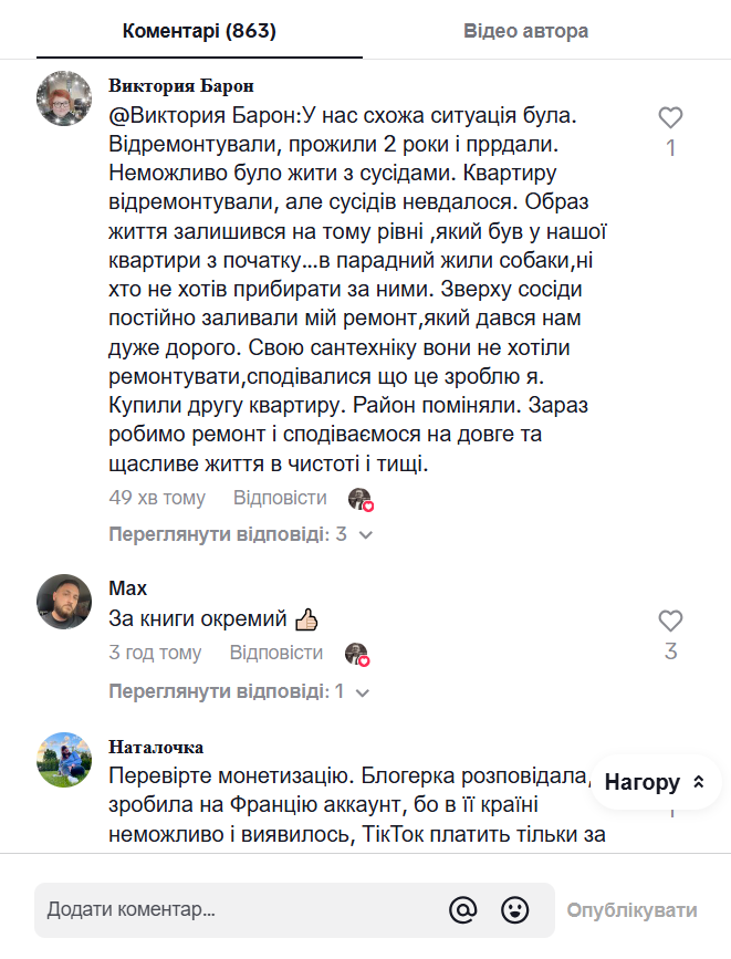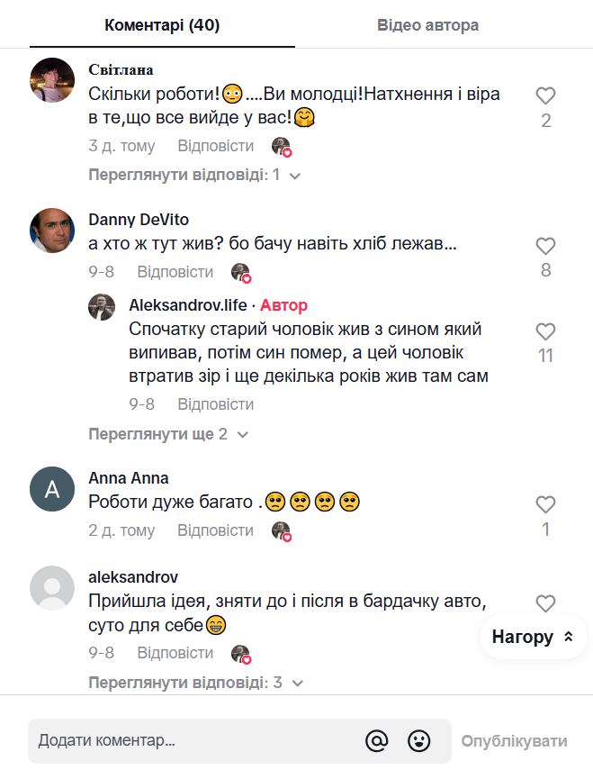 В комментариях зрители поддерживают Александра, а также делятся собственными похожими историями, иногда дают советы, как лучше справиться со всеми вызовами, чтобы потом не пришлось переделывать.