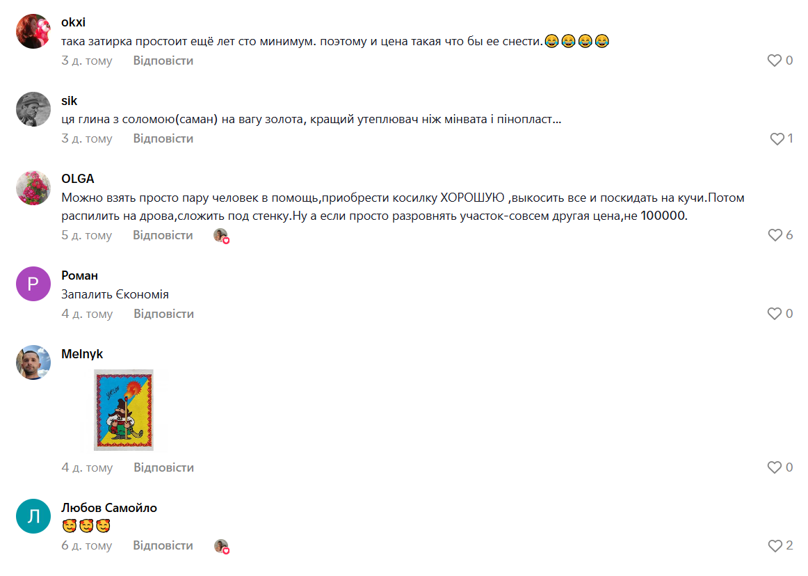Женщина, которую зовут Валерия, рассказала свою историю. "Интересная цена, мы под Каменец-Подольским купили дом с газом за 120 тыс. грн", — поделилась она. Мужчина, подписанный как "Мельник", опубликовал фотографию спичек, намекая, что проще сжечь дом.