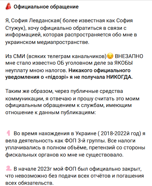 "Из СМИ (всевозможных Телеграм-каналов) вдруг мне стало известно об уголовном деле за якобы неуплату мной налогов. Никакого официального сообщения о "подозрении" я никогда не получала", — заявила Стужук.