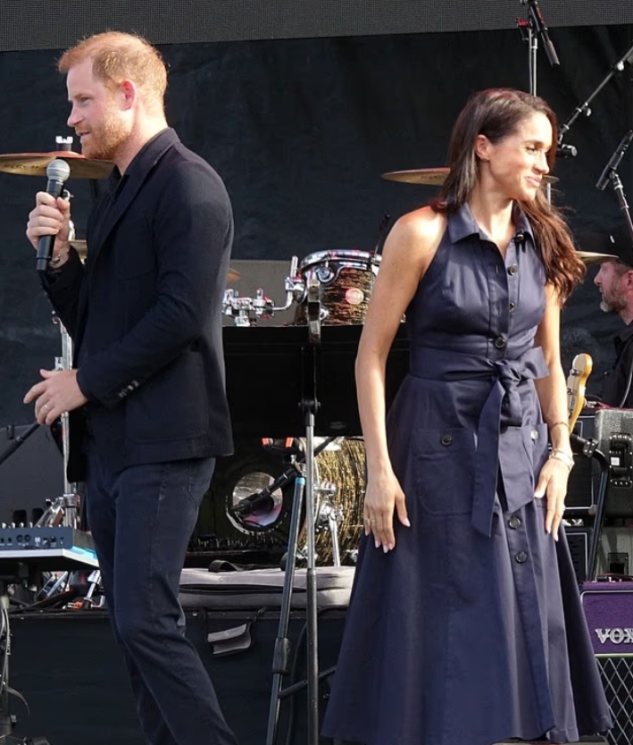 Все вместе эти украшения создали роскошный ансамбль в сочетании с темно-синим платьем без рукавов и классическими туфлями. Гарри выбрал более сдержанный образ — черную рубашку и пиджак. Супруги приветливо общались с гостями и первыми респондентами, для которых и проводилось мероприятие.