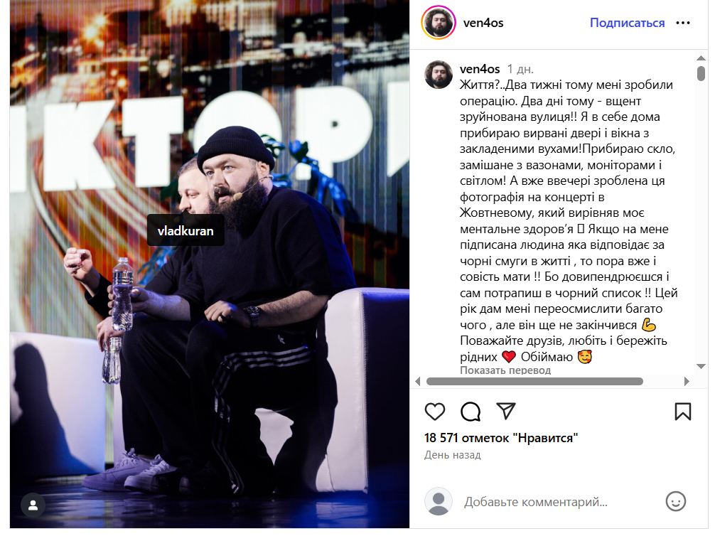 "Жизнь? Две недели назад мне сделали операцию. Два дня назад — полностью разрушенная улица! Я у себя дома убираю вырванные двери и окна с заложенными ушами! Убираю стекла, замешанные с вазонами, мониторами и светом! А уже вечером сделана эта фотография на концерте в Октябрьском, который выровнял мое ментальное здоровье", — отметил Александр.