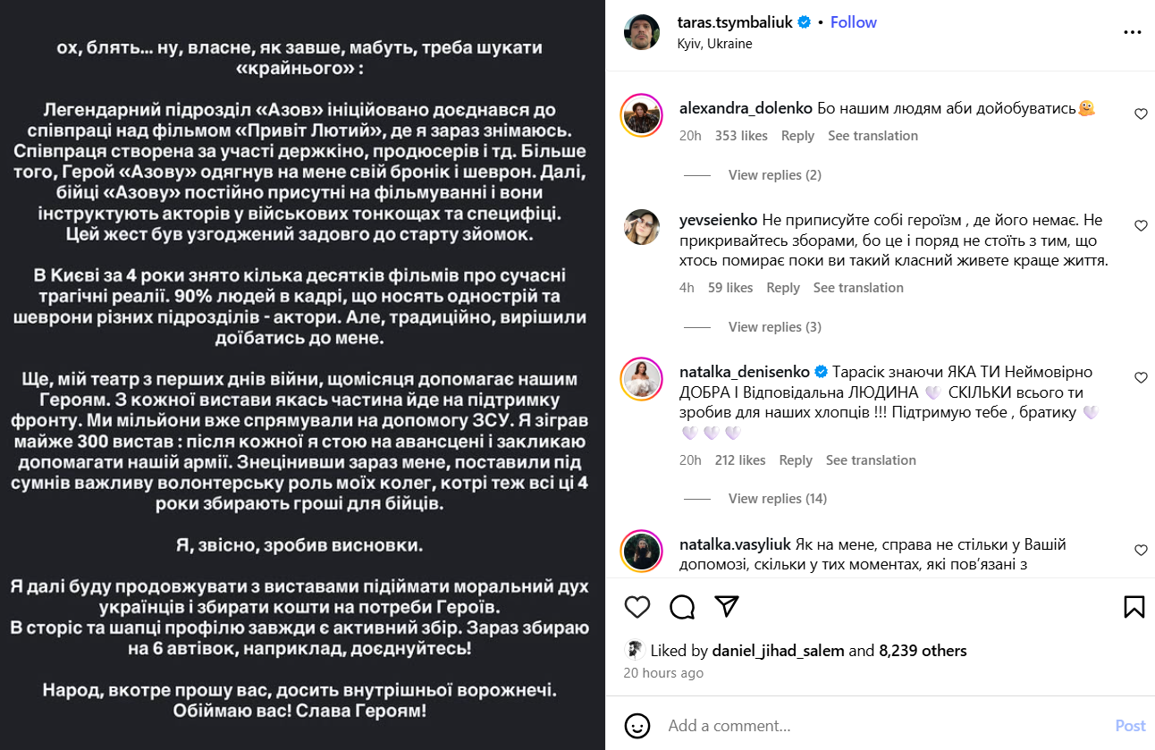 "У меня "подгорает", когда люди, мало касающиеся украинской армии, помощи военным, одевают форму и играют украинских военных. Меня от этого тошнит. Когда я увидел шеврон "Азова" на Тарасе, меня вообще вывернуло. Люди блюют за этот шеврон на базовом курсе боевой подготовки, чтобы его заслужить. Если нет, то потом доказывают свою боеспособность на боевых. И Тарас Цимбалюк со своими зашкварами с русской музыкой с подружкой Алхим", — подчеркнул актер-воин.