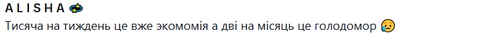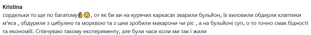 "Сардельки – это еще по-богатому, вот как бы вы на куриных каркасах сварили бульон, их выловили, ободрали клочки мяса, обманули с луком и морковью и с этим сделали макароны или рис, а на бульоне суп, вот это точно вкус бедности. Сочувствую такому эксперименту, но были времена, когда мы так и жили", "Это уже как диета. На еде нельзя экономить. Это энергия, силы, витамины. Самое главное сбалансированное питание. Потому лучше больше зарабатывать. Вы еще молоды", "Мне кажется, 2 тысячи это слишком мало хотя б 3000, но интересно, получится ли у вас", "сардельки, сыр и экономия в одном предложении не должны быть", "Тысяча в неделю это уже экономия, а две в месяц это голодомор", – пишут под видео.