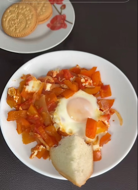 На второй день из остатков перца, помидора и яйца девушка приготовила на завтрак шакшуку, а на десерт – чай с молоком.