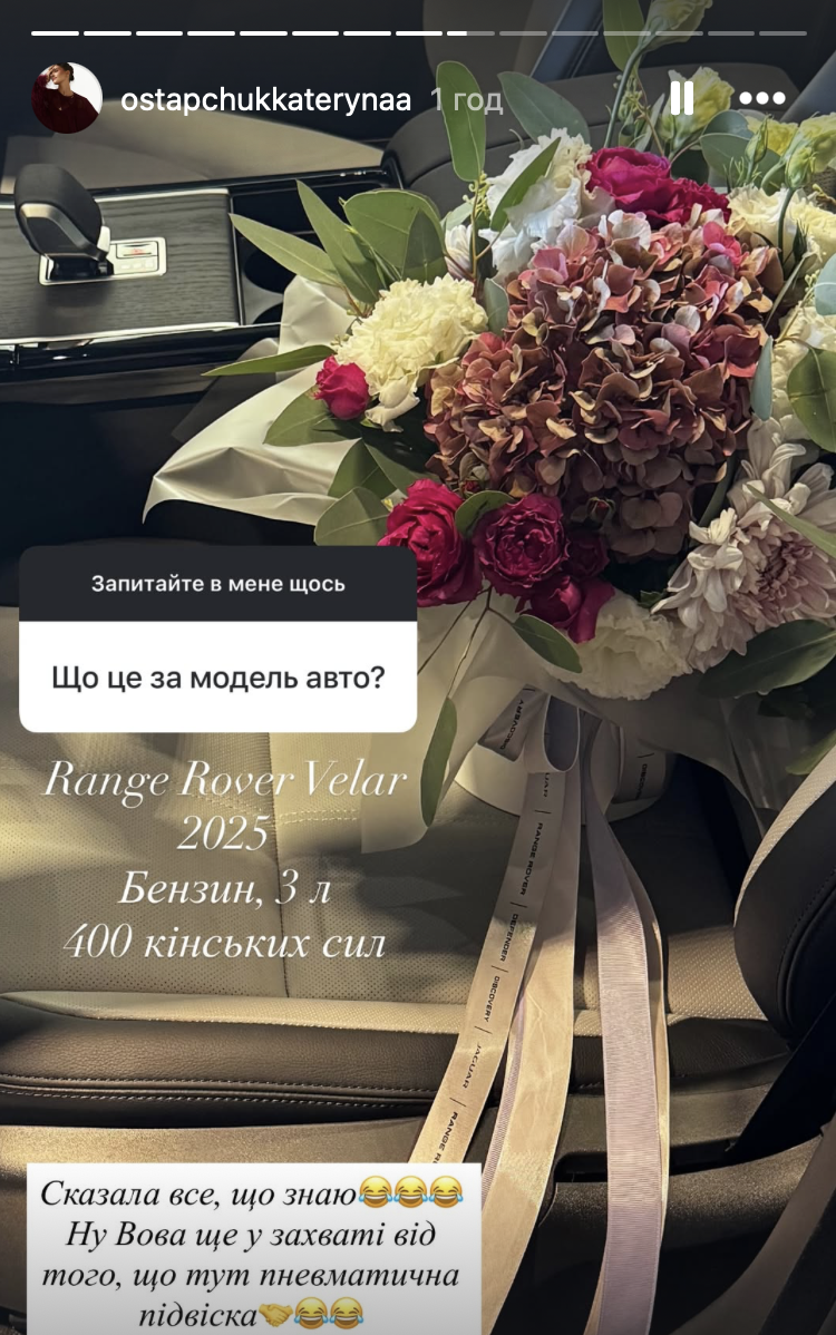 В "историях" Екатерина уточнила, что получила в подарок Range Rover Velar 2025. Ее новая машина — на бензине, и имеет объем двигателя 3 литра. Количество лошадиных сил достигает 400.