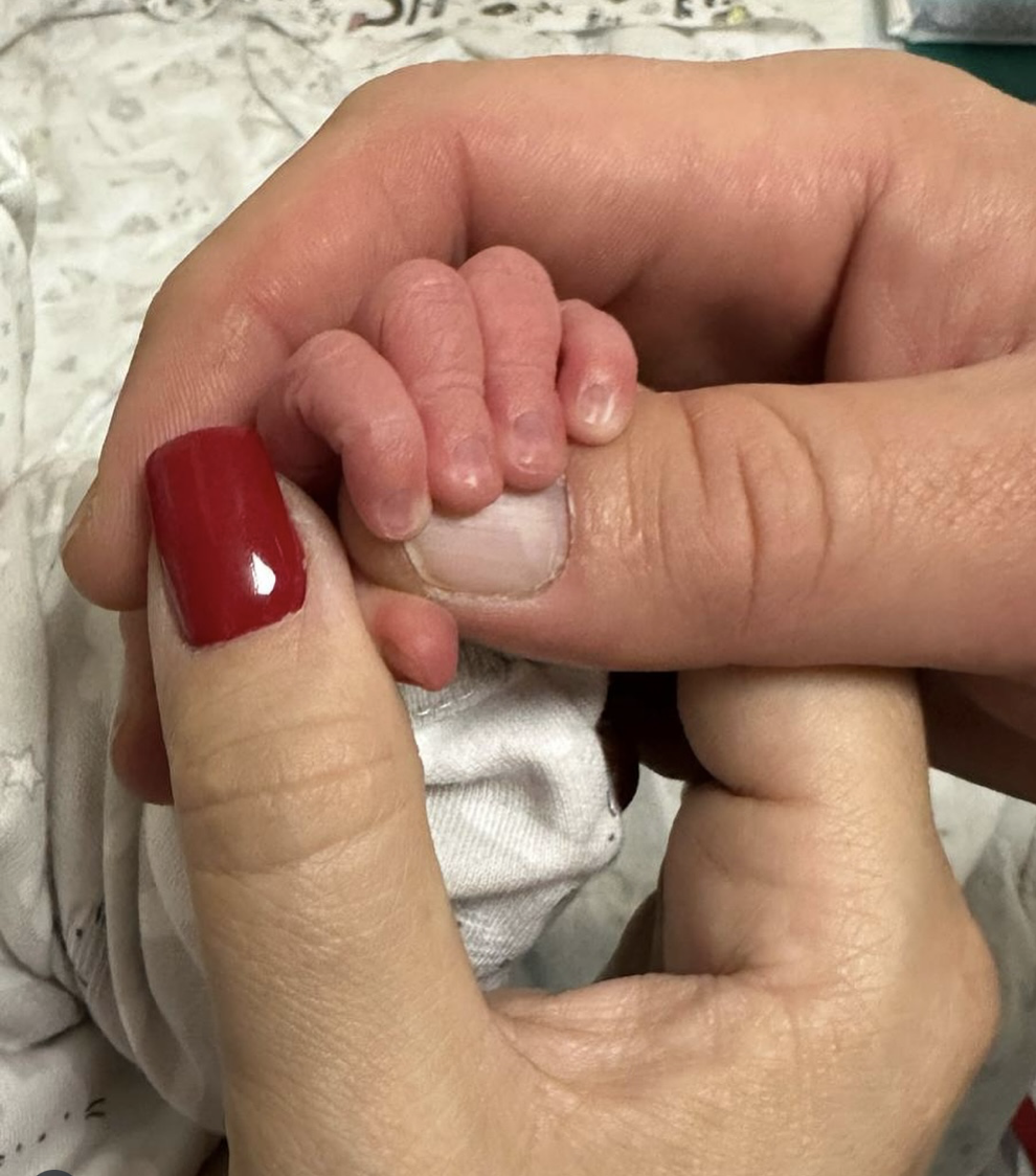 Актер-воин также показал первый кадр с новорожденным: на нем мальчик крепко держит маленькой рукой пальцы родителей.
