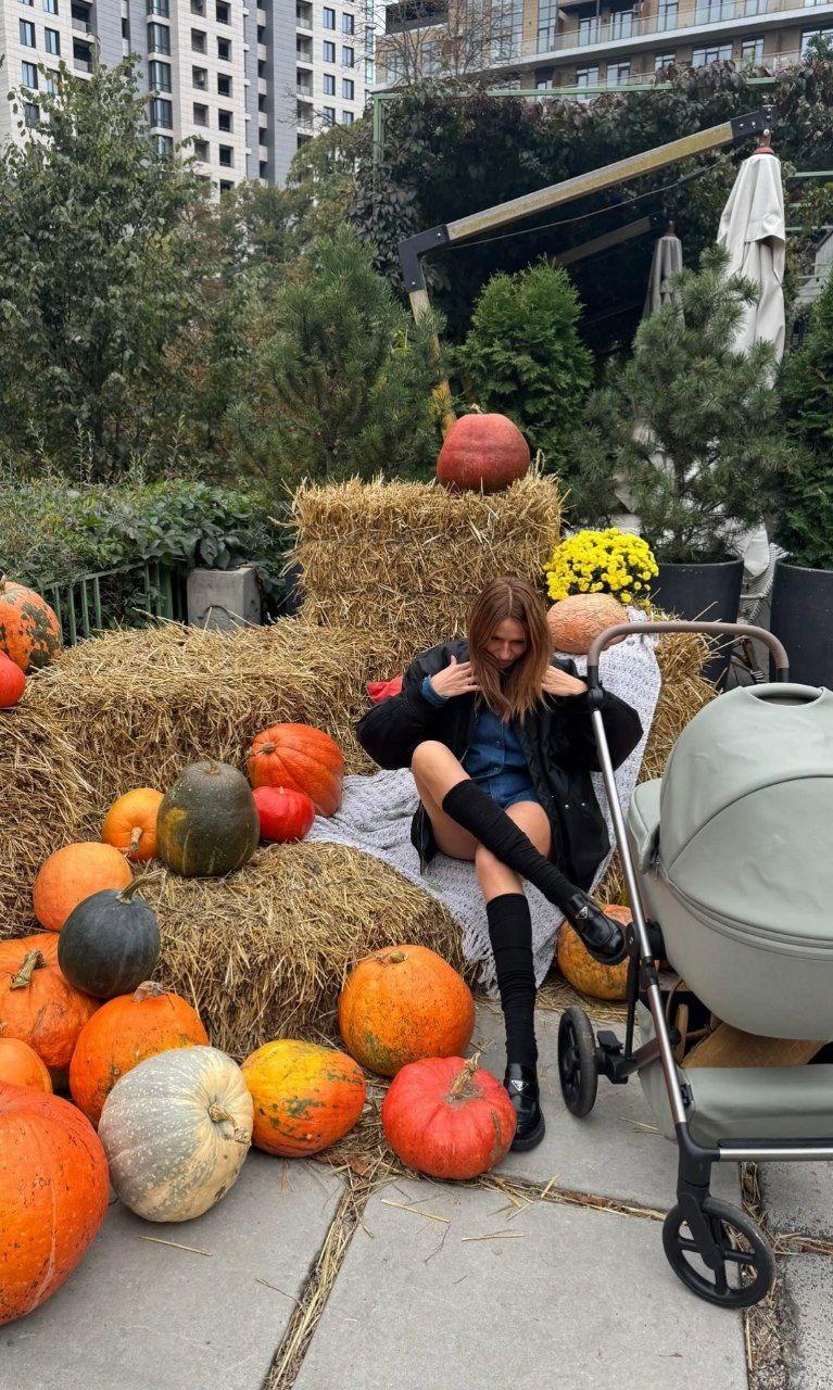 На другом фото Никитюк позирует уже с сыном, которому вскоре исполнится четыре месяца. Телеведущая сидит возле коляски серого цвета на фоне осенней локации, украшенной тыквами и сеном.
