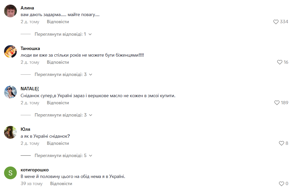 В комментариях зрители оставили много отзывов. Некоторые, услышав реакцию Лизы на грязные яйца на завтраке, попросили продемонстрировать больше благодарности: "Вам дают даром... Имейте уважение", "Даже в Норвегии вам кто-то что-то должен". Другие реакции в основном также были негативными.