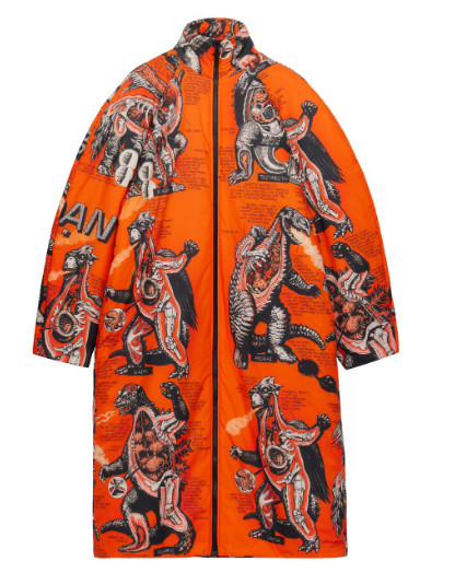 Мужской бренд Lu'u Dan представил длинное пальто оверсайз с графическим принтом "Монстры" во флуоресцентно-оранжевом цвете. Вдохновением для коллекции стали японская мифология и классические видеоигры.
