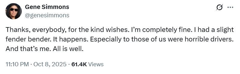 Сам Джин Симмонс вскоре после происшествия вышел на связь со своими поклонниками. Он написал в соцсетях, что с ним все хорошо, а столкновение назвал "легким". Также он поблагодарил поклонников за добрые пожелания и назвал себя плохим водителем.