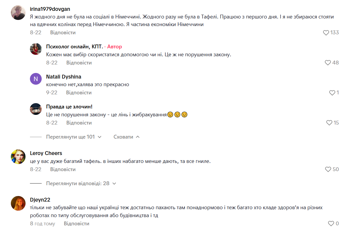 - "Я ни дня не была на социалке в Германии. Ни разу не была в Tafel. Работаю с первого дня. И я не собираюсь стоять на благодарных коленях перед Германией. Я часть экономики Германии", — написала зрительница, которую зовут Ирина;
