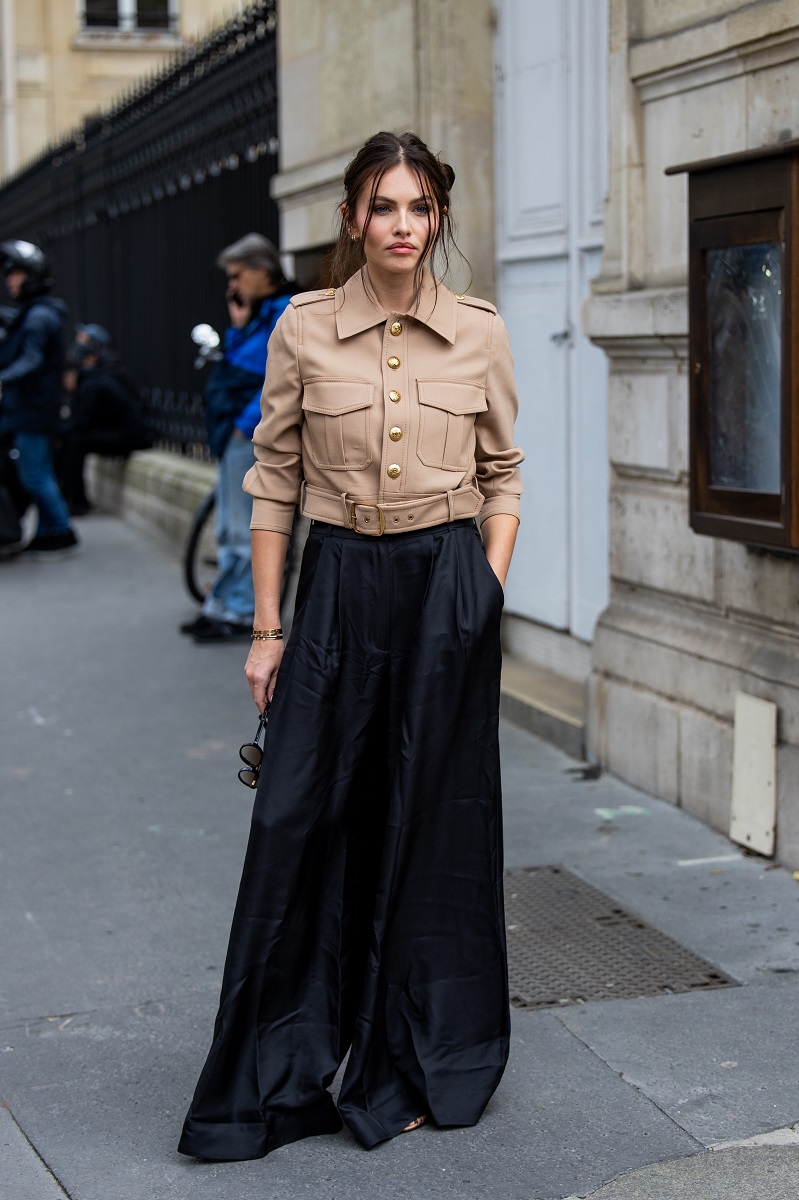 Модель демонстрировала шикарный образ в бежевой куртке в стиле милитари и брюках с высокой талией, стоя с улыбкой на улице перед показом женской коллекции Zimmermann Весна/Лето 2026 на Неделе моды в Париже.