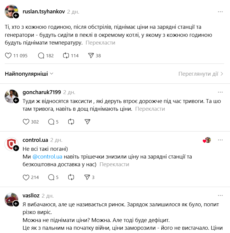 Учитель физики Руслан Цыганков жестко раскритиковал спекулянтов. Его резкое заявление в соцсети Threads вызвало бурную дискуссию в сети относительно нравственности ценообразования на генераторы и зарядные станции во время войны.