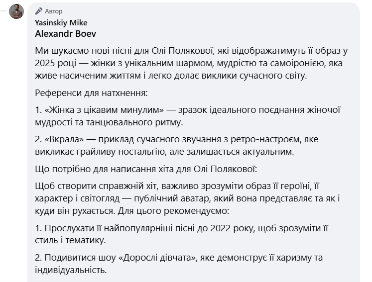 В комментариях к публикации пользователи попросили показать само задание — и Ясинский выполнил просьбу. Продюсер обнародовал подробный бриф, в котором говорится о поиске новых треков для Оли Поляковой, которые должны были бы отразить ее обновленный образ в 2025 году.