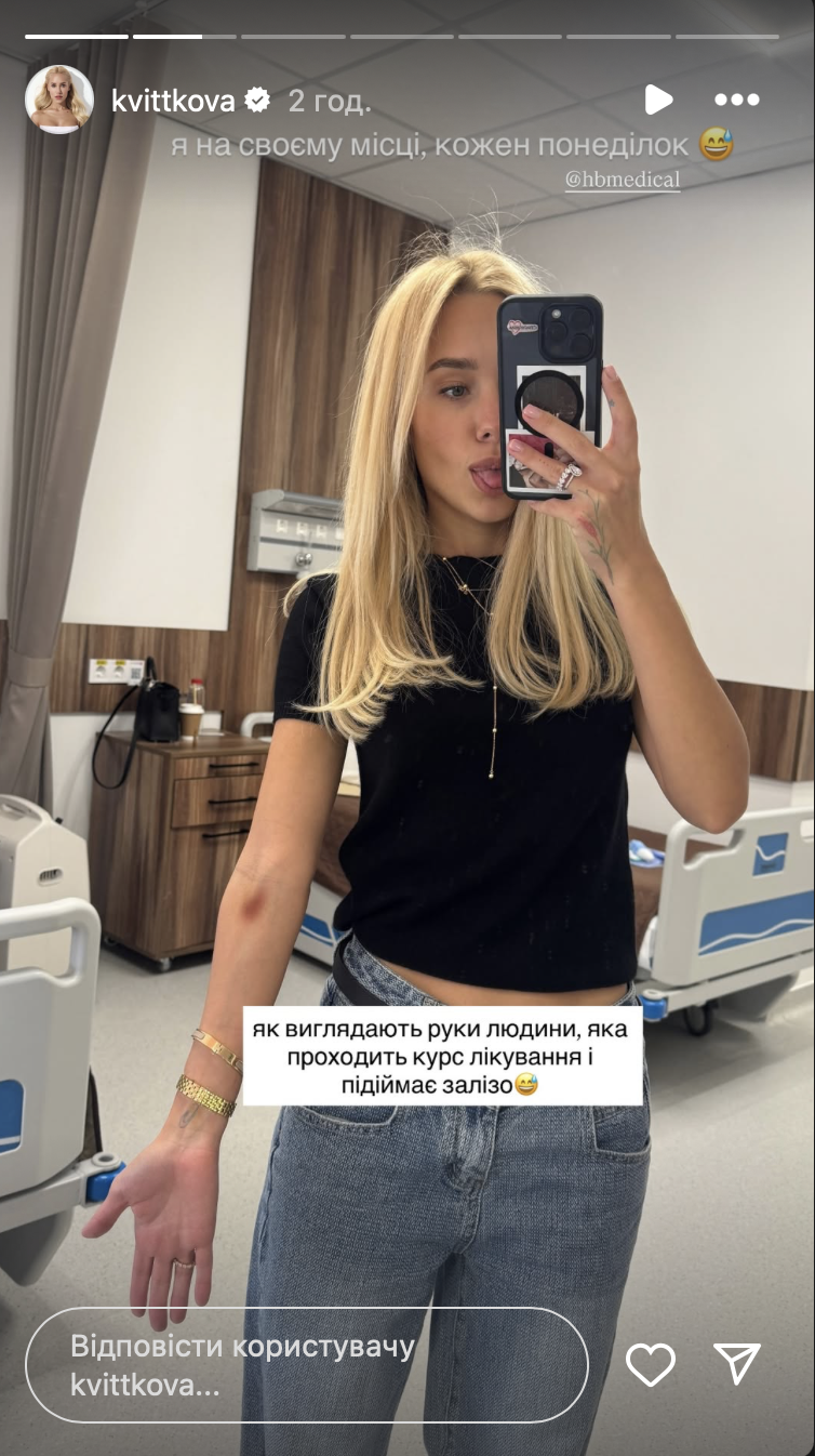 После медицинских процедур на руках Квитковой появились заметные синяки. Блогерша успокоила фолловеров, чтобы они не волновались, и объяснила, что синяки появились из-за регулярных капельниц с железом.