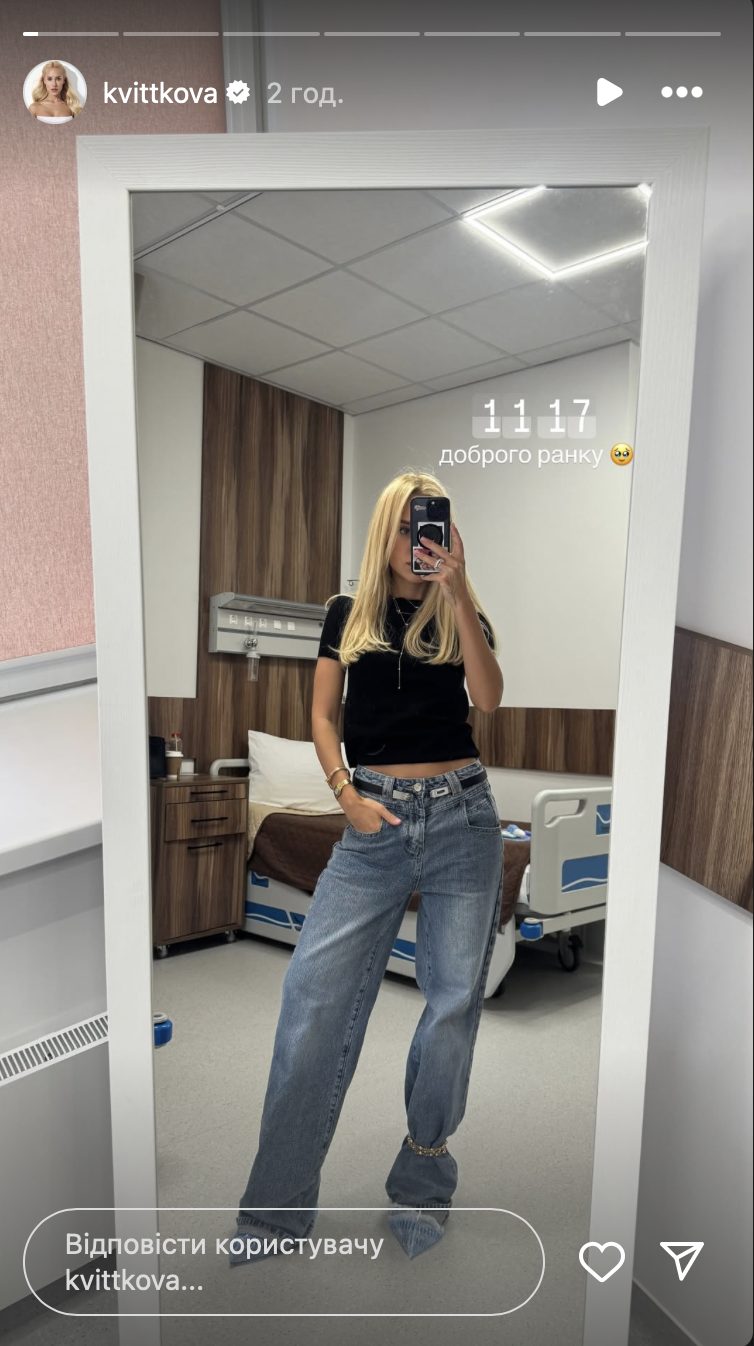 Оказалось, что в организме звезды сети недостаточный уровень железа. Поэтому каждый понедельник Квиткова ходит в больницу, чтобы сделать необходимую капельницу. На селфи, сделанном в зеркале, она позирует посреди палаты, одетая в синие джинсы и черную футболку, а на ногах у нее — бахилы.