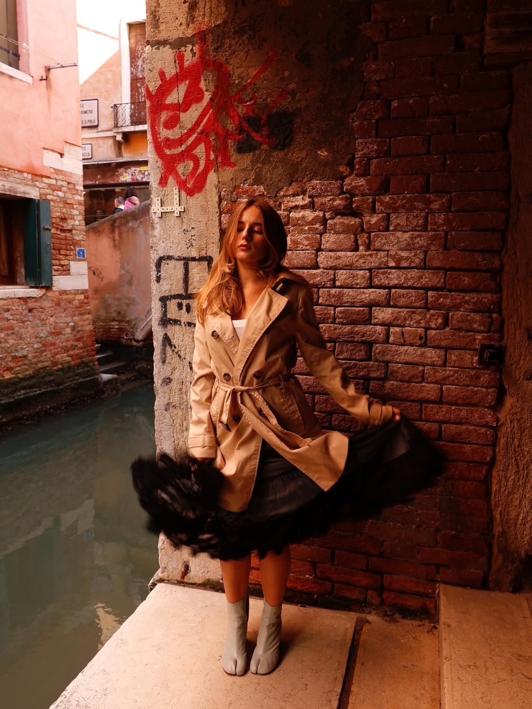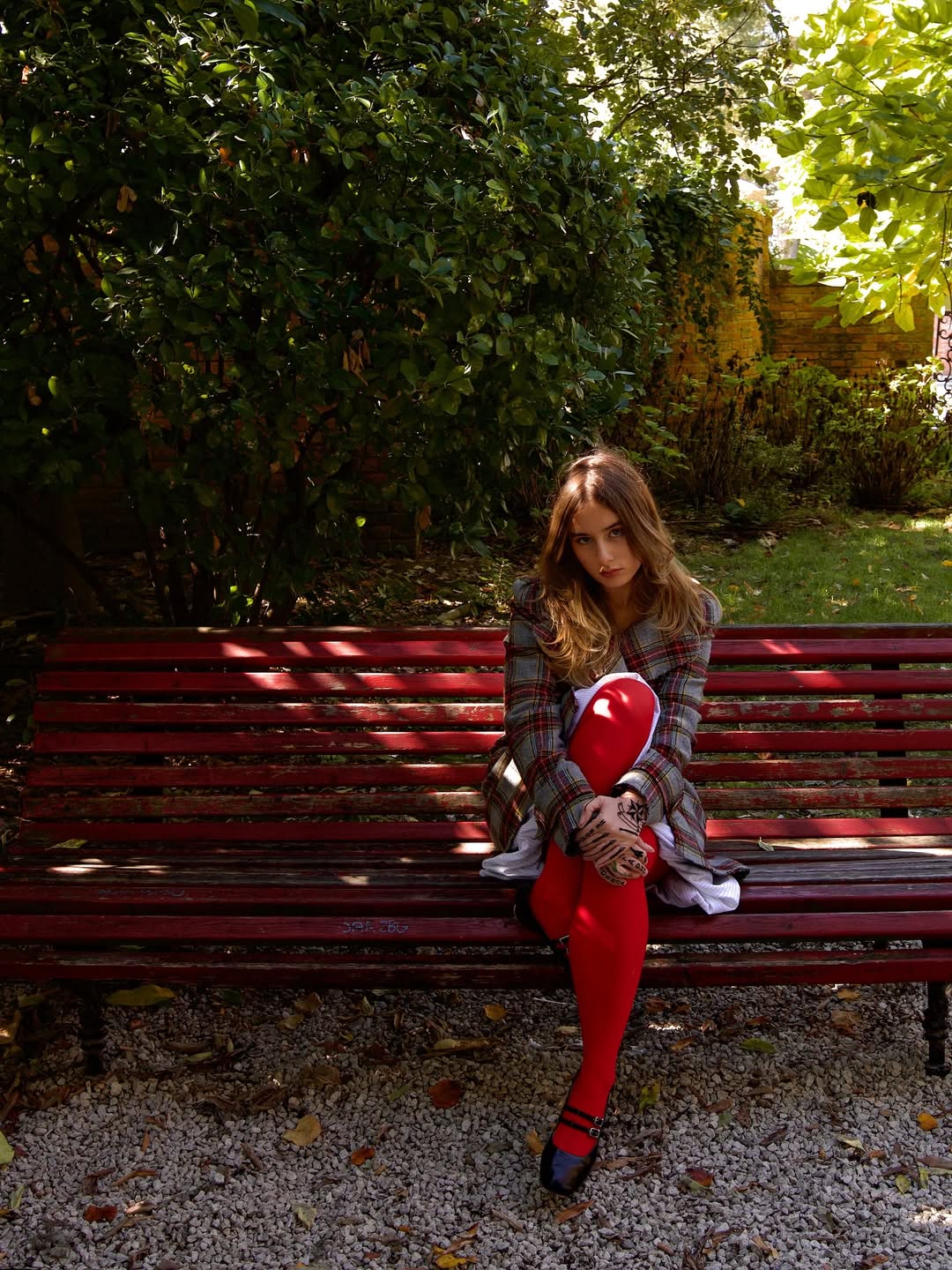В частности, на одном из фото она позирует в ярко-красных колготках, платье и туфлях Mary Jane. На другом — демонстрирует бежевый тренч в сочетании с модными ботильонами tabi с раздвоенными носками.