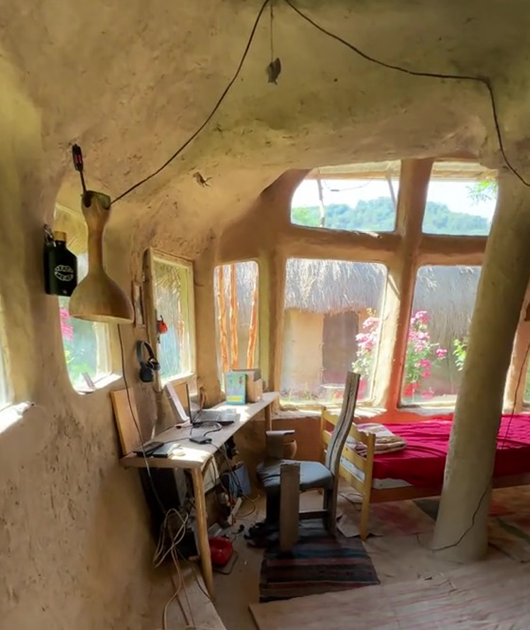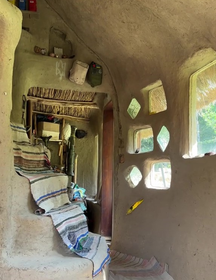 Мужчина использует солнечные панели, чтобы обеспечивать свое жилье электроэнергией, а также обогреваться. Устройства расположены на крыше дома. Далее хозяин продемонстрировал, как уже 10-й год подряд строит свое жилье, используя деревянные колья как основу и глину, сено и воду.
