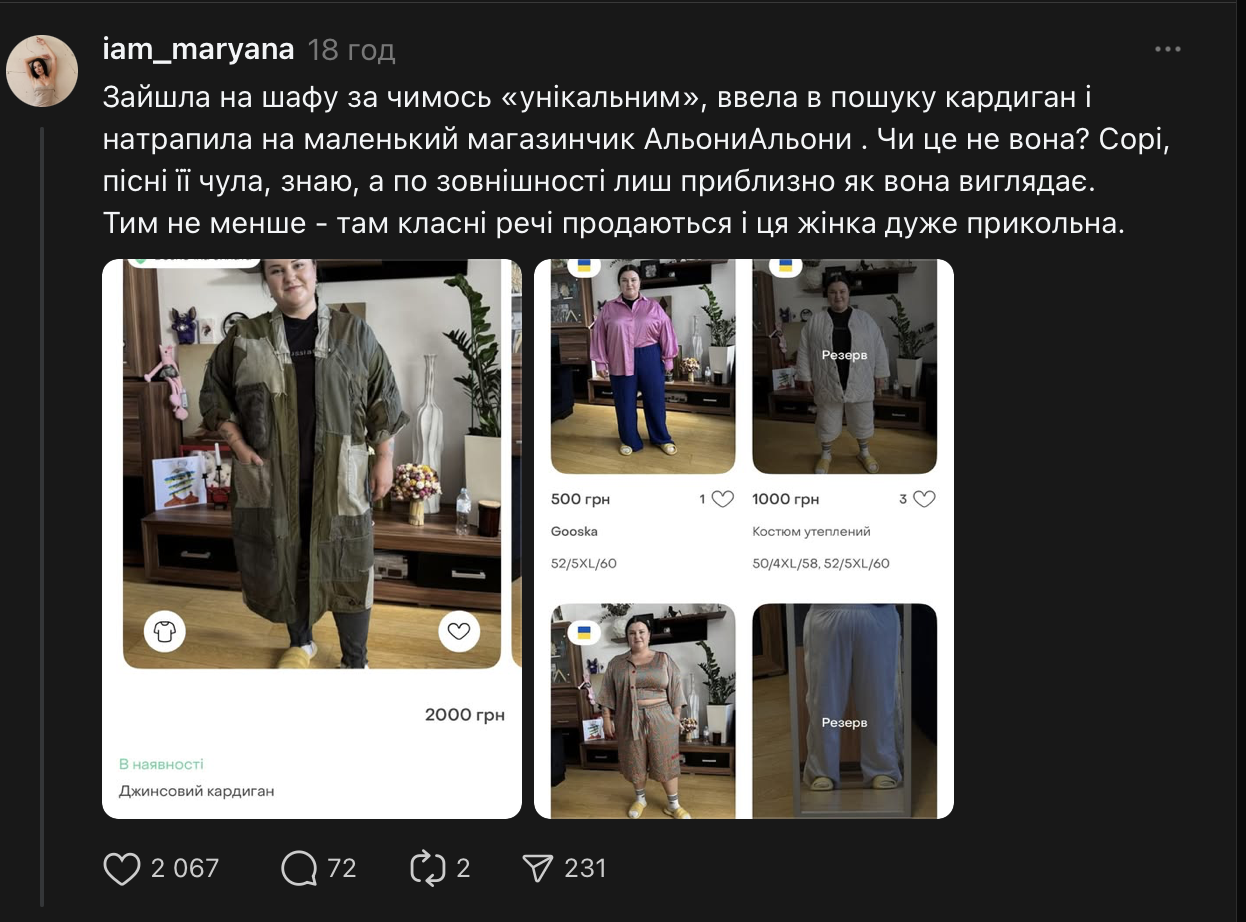 "Зашла на Шафу за чем-то "уникальным", ввела в поиске кардиган и наткнулась на маленький магазинчик АленыАльоны. Или это не она? Сори, песни ее слышала, знаю, а по внешности лишь примерно, как она выглядит. Тем не менее — там классные вещи продаются и эта женщина очень прикольная", — написала внимательная пользовательница сети.