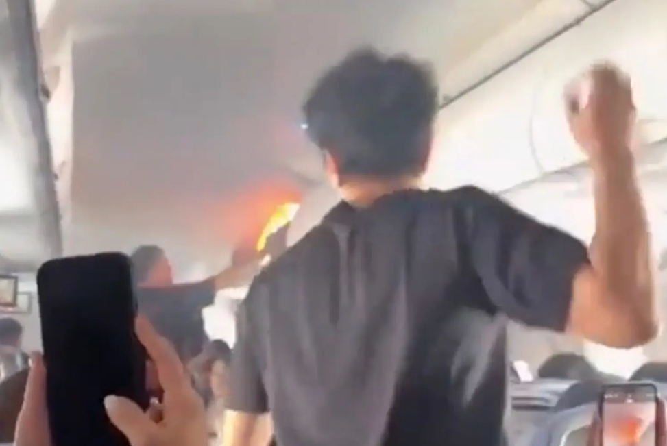 Двое бортпроводников бегут с огнетушителями, а другие кричат пассажирам, чтобы они оставались на своих местах. Один из пассажиров рассказал, что они услышали громкий взрыв за мгновение до того, как из отсека вырвалось пламя.