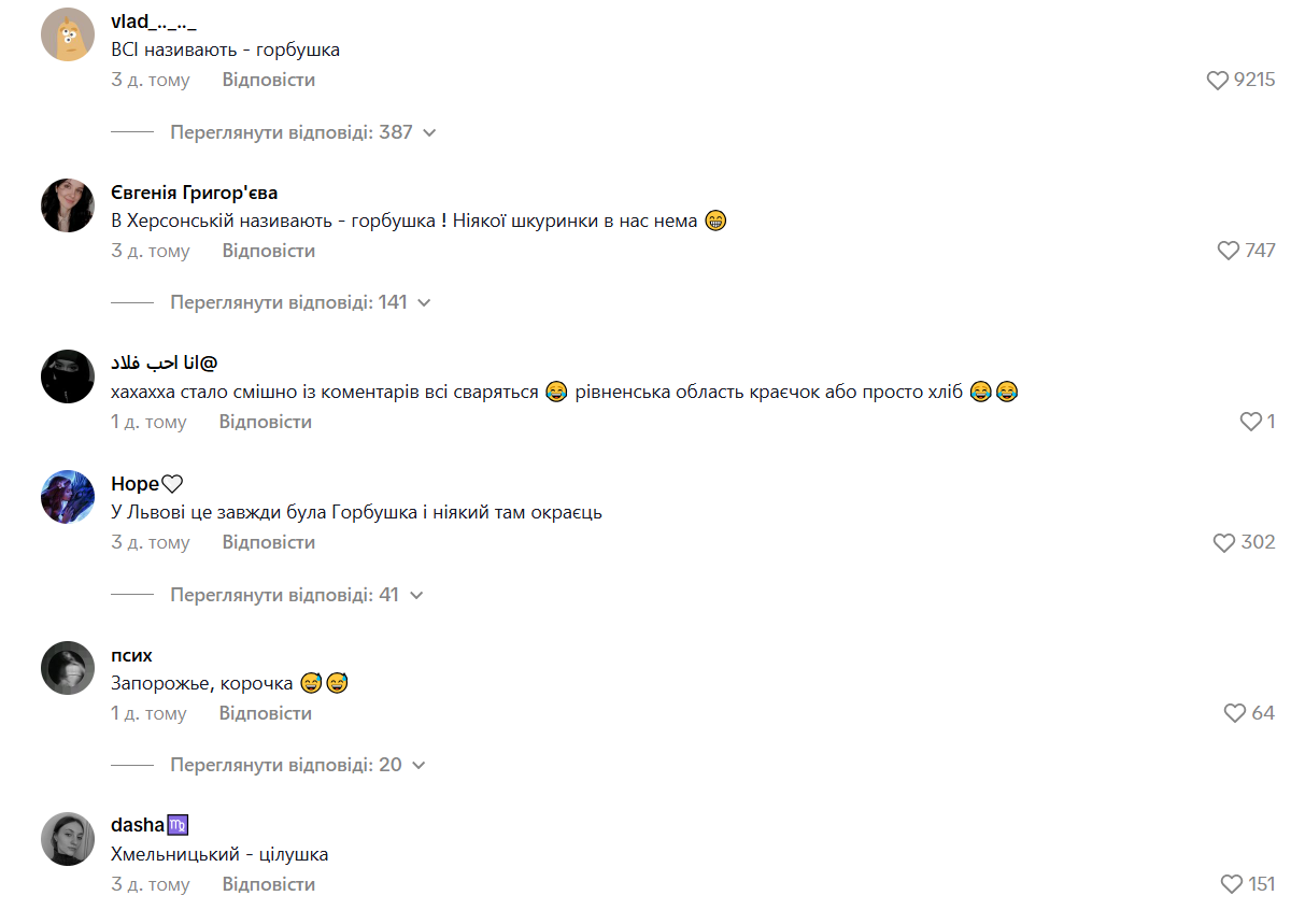 "А вы знали, что эту часть хлеба в разных регионах Украины называют по-разному. В Черкасской области эту часть хлеба называют целушкой. Говорят: "Целушка, чтобы ребята целовали. На Житомирщине говорят "корочка". В Донецкой области — "горбушка". В Херсонской — "шкуринка". Во Львовской области — "окраєць". Его часто оставляли для самого маленького в семье. А как этот кусочек называется у вас", — поинтересовалась автор видео у своих подписчиков.