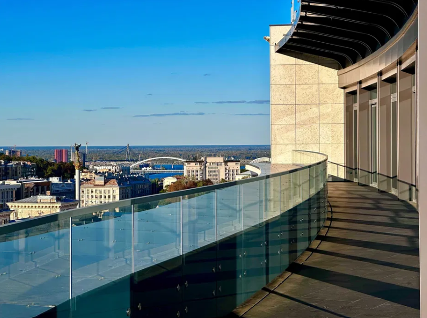 В Киеве недалеко от Офиса президента продается пентхаус за 9 млн долларов со стеклянным куполом над террасой, которая имеет самый большой в Украине угол обзора. Квартира занимает весь 14-й этаж здания.