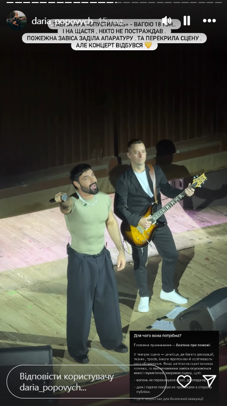 Во время выступления украинского певца на сцене в Хмельницком произошла чрезвычайная ситуация — внезапно начал опускаться пожарный занавес, весящий несколько тонн. Артист избежал травм и остался невредимым.