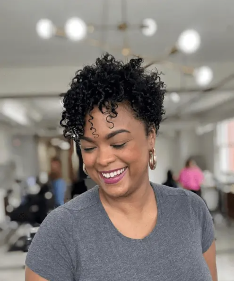 Короткая, упругая и неприхотливая к уходу, эта стрижка пикси позволяет естественным локонам сиять, при этом сохраняя шик и непринужденность.