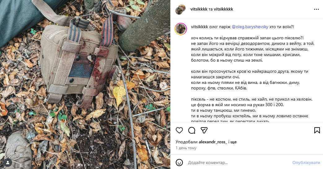 "Пиксель — не костюм, не стиль, не хайп, не прикол на Хэллоуин. Это форма, в которой мы носим на руках 300 и 200 (раненых и погибших — ред.). Ты в нем танцуешь, мы погибаем. Ты в нем пробуешь коктейль, мы в нем ловим последний воздух перед тем, как перестать дышать", — отметил "Вицик".