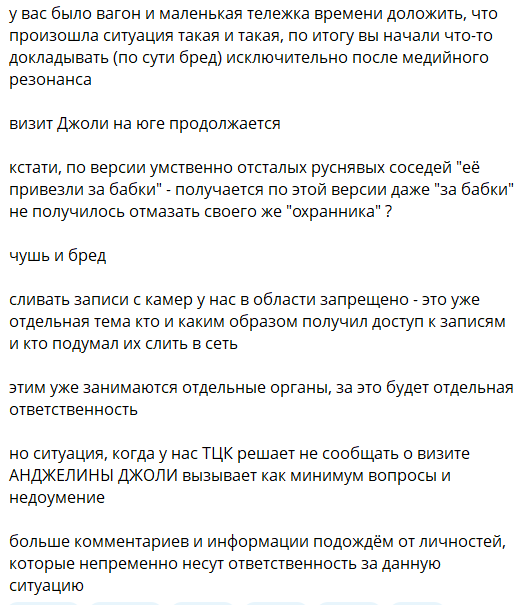 "Что именно делала Джоли в ТЦК мне неизвестно — версию ТЦК что я услышал (а вы уже прочитали про туалеты), публиковать не буду. Если эта их версия будет (уже) опубликована — то можете паковать чемоданы на выход с должностей, потому что в этот бред сумасшедшего никто не поверит. У вас было вагон и маленькая тележка времени доложить, что произошла ситуация такая и такая, по итогу вы начали что-то докладывать (по сути бред) исключительно после медийного резонанса", – подчеркнул автор.
