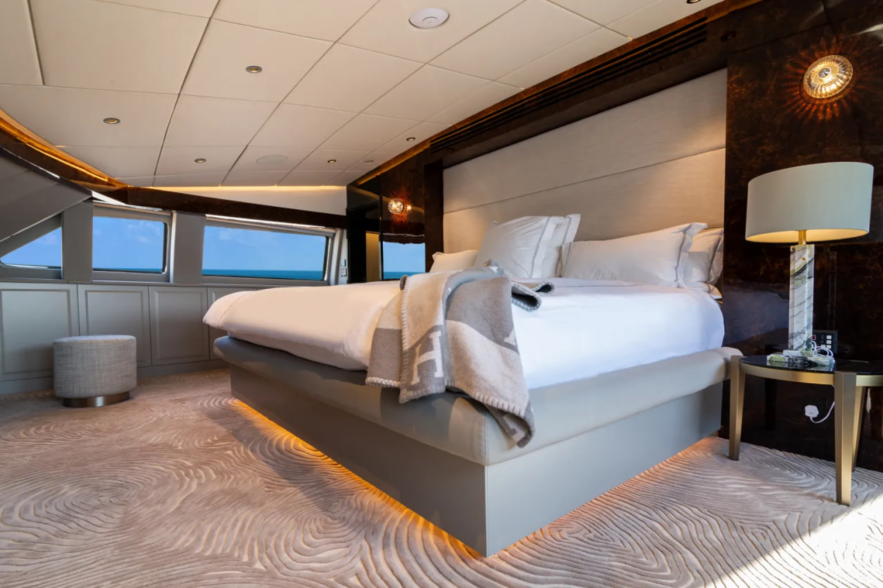 В число особенностей яхты входят просторные открытые палубы, двойная лестница к плавательной платформе, а также большие зоны отдыха, позволяющие пассажирам наслаждаться морскими пейзажами.
