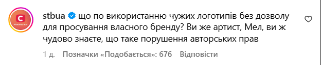 СТБ отреагировал на публикацию и обратился к Melovin с замечанием: "Что по использованию чужих логотипов без разрешения для продвижения собственного бренда? Вы же артист, Мел, вы же прекрасно знаете, что такое нарушение авторских прав".