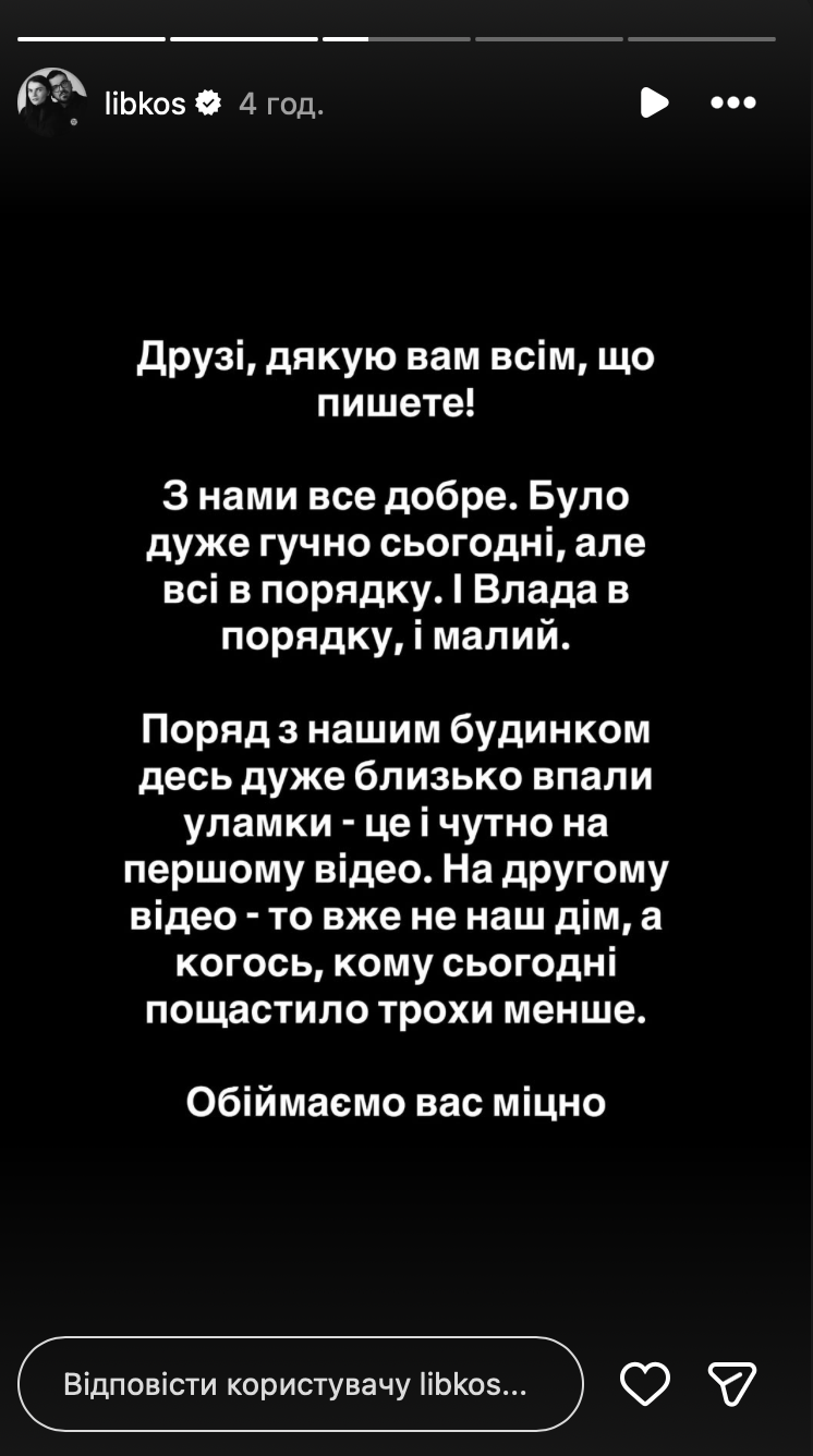 Либеровы отметили в соцсетях, что с ними все хорошо, но вблизи их дома упали обломки, вызвав громкие звуки взрывов.