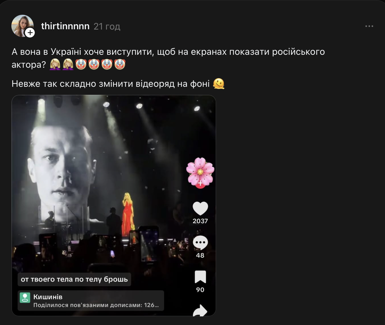 "А она в Украине хочет выступить, чтобы на экранах показать российского актера? Неужели так сложно изменить видеоряд на фоне", — написала пользовательница сети с ником thirtinnnnnnn.