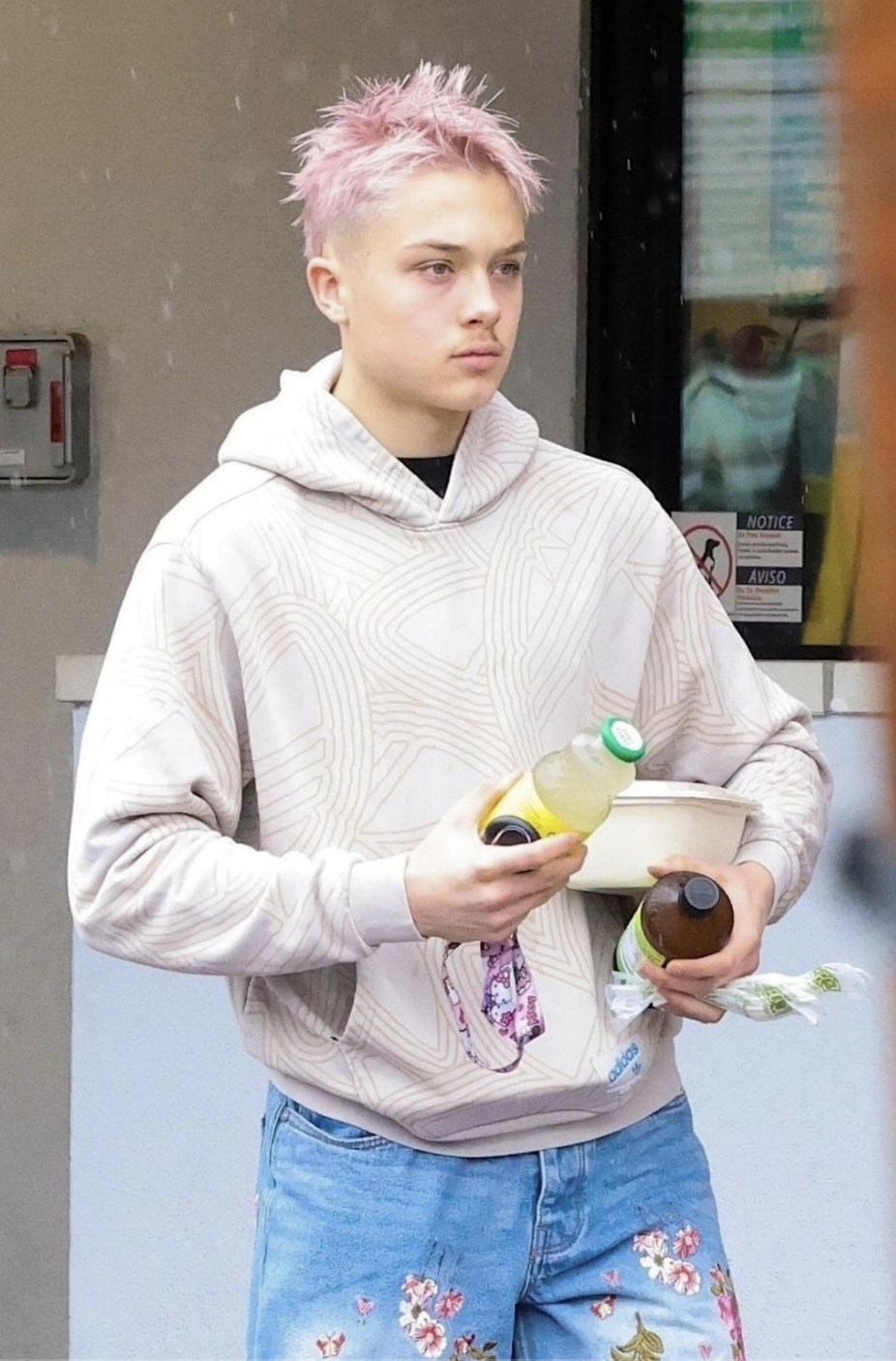 Нокс также носил бледно-розовую толстовку и джинсы с цветочной вышивкой, когда покупал еду с другом на рынке Lazy Acres Market в Лос-Фелизе, Калифорния.
