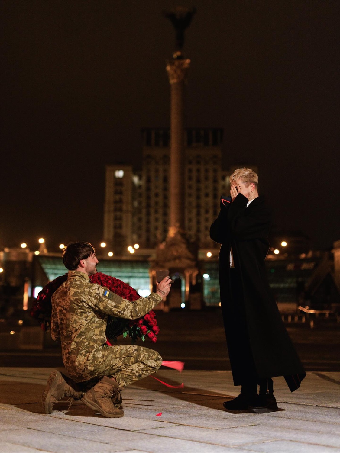 Предложение с кольцом состоялось на Майдане Независимости в Киеве. MELOVIN и Петр Злотя обнародовали совместные фото этого момента.
