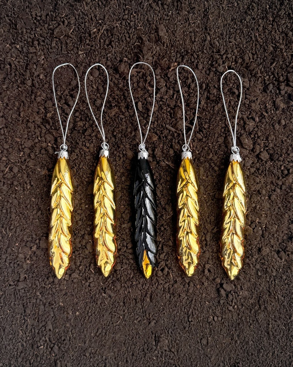 В набор вошли пять елочных украшений в форме колосков: четыре золотые и один черный ("обожженный"). В BEVZA отметили, что они символизируют "силу земли, труд рук и свет, который сохраняется даже в темные времена" и "олицетворяют возрождение, надежду и единство поколений".