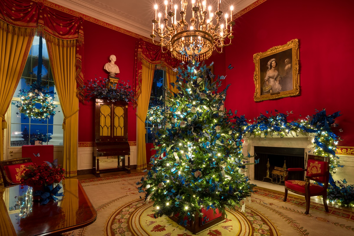 Вместе они украсили Красную комнату Белого дома синими бабочками. Это – отсылка к ее инициативе "Fostering the Future", которая направлена на поддержку приемных семей, которой миссис Трамп занимается с 2021 года.