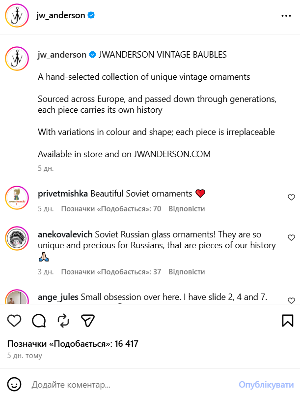 Джонатан Андерсон представил коллекцию винтажных елочных украшений, которые напомнили пользователям советские игрушки. Фото появились на официальной странице бренда. Пользователи сразу заметили сходство с елочными игрушками, которые штамповали в СССР. Фокус также обратил на это внимание.
