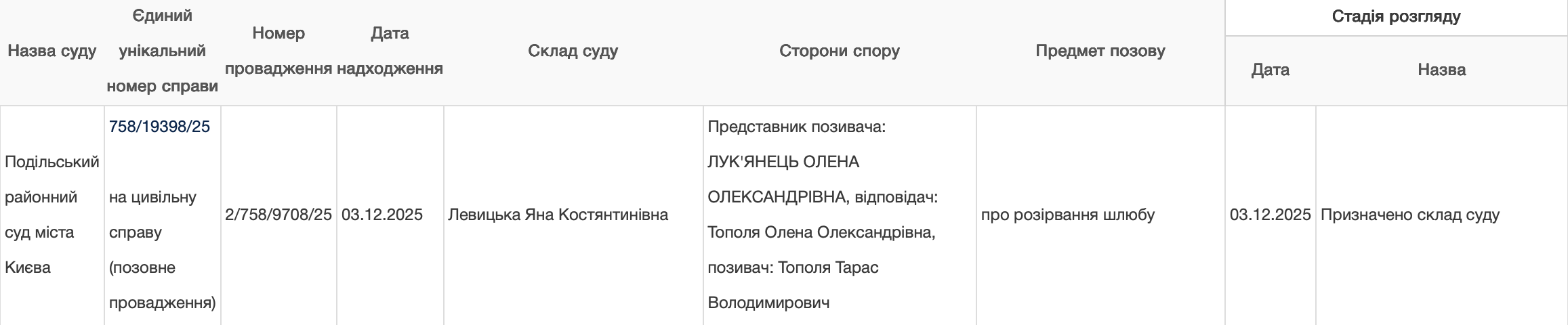 Истцом стал Тарас Тополя, а ответчиком — Елена. Состав суда назначен, а дата рассмотрения дела пока неизвестна.