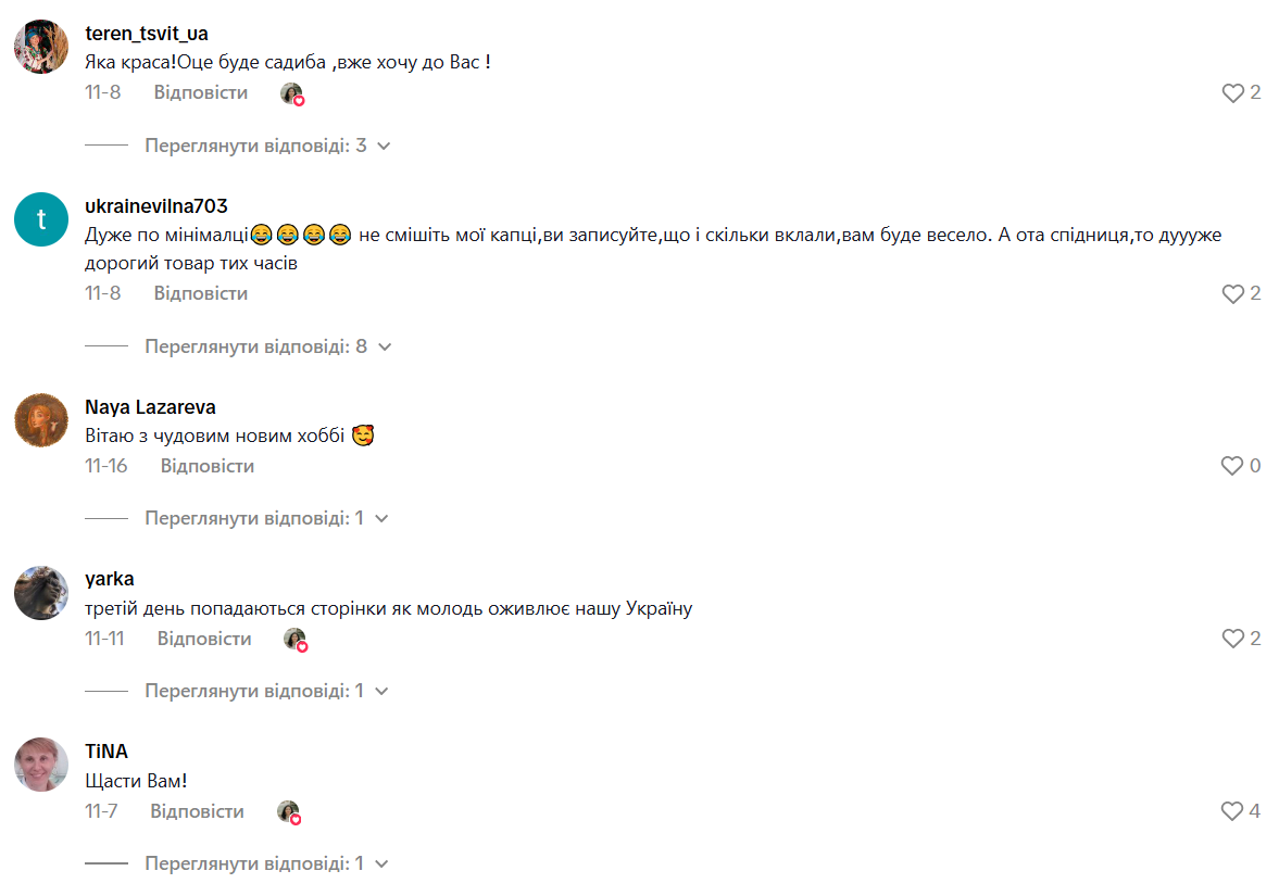 - "Третий день попадаются страницы, как молодежь оживляет нашу Украину", — поделилась следующая пользовательница.