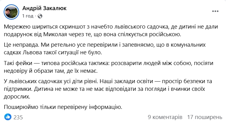 "В сети распространяется скриншот из якобы львовского садика, где ребенку не дали подарок от Николая из-за того, что он общается на русском. Это неправда. Мы тщательно все проверили и уверяем, что в коммунальных садах Львова такой ситуации не было", — написал в Facebook Андрей Закалюк, директор Департамента образования и культуры Львовского городского совета.