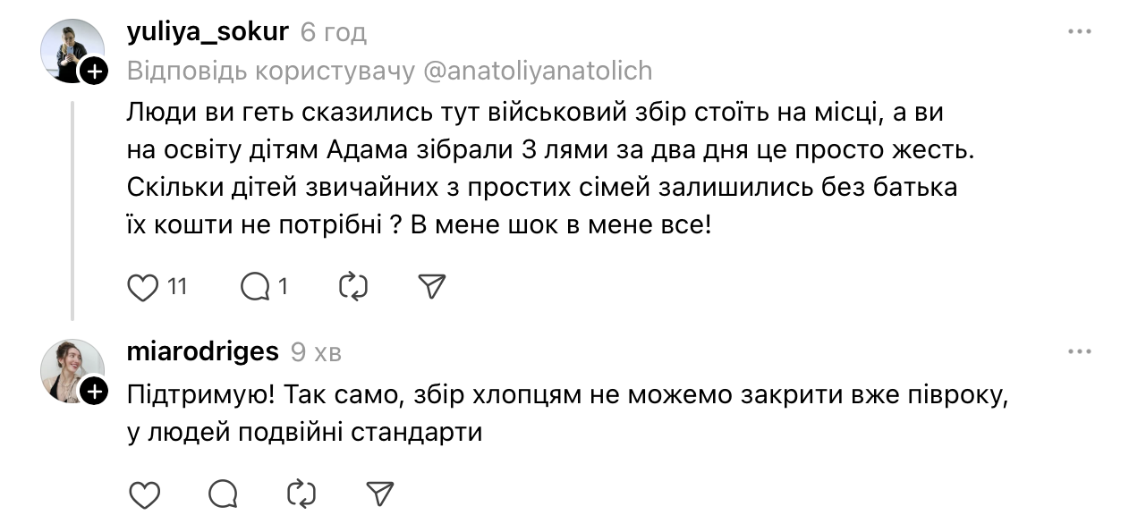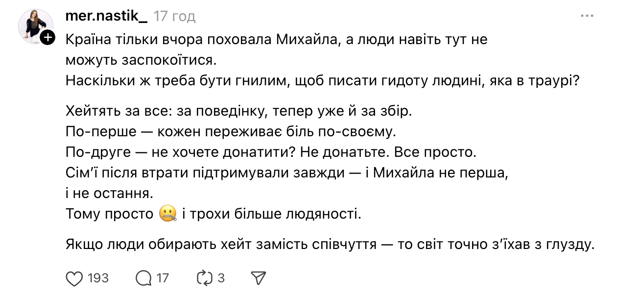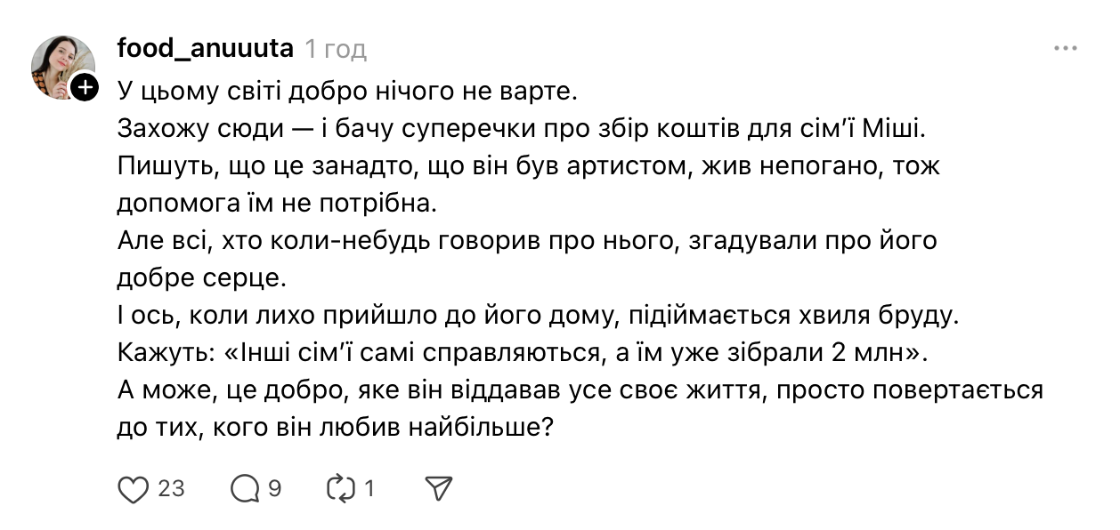 По ее словам, в Threads под постом Анатолича "нормальные люди тоже были в истерике", читая комментарии о том, что помощь детям Клименко якобы нецелесообразна. Жена ведущего в комментарии Фокусу подчеркнула, что поддержка семьи погибшего артиста никоим образом не противоречит помощи армии — люди способны делать и то, и другое.