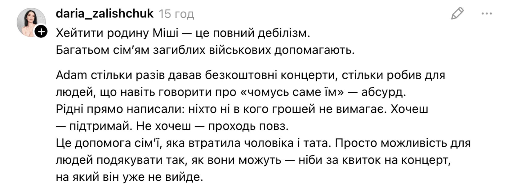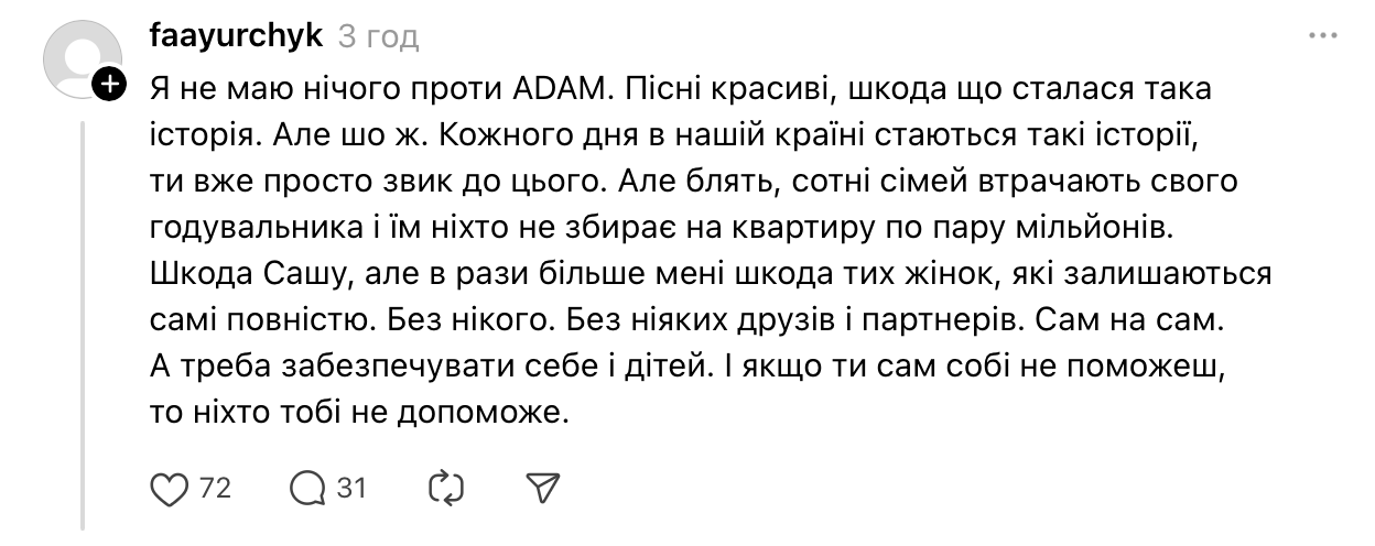 "Все нормальные люди послали н**уй, как и он, тех, кто пишет, что хватит помогать семье Адама. Дело не в том, чтобы не помогать армии. А в том, что и армии помогают. И детям Адама. И тому, кому считают нужным", — отметила она.