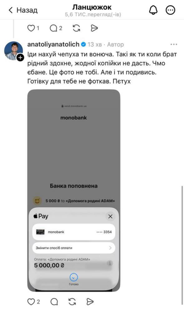 Украинский ведущий Анатолий Анатолич резко отреагировал на комментарий человека под его сообщением о сборе для семьи Клименко. После того как пользователь в Threads обвинил его в якобы неискренности и потребовал показать перевод, Анатолич опубликовал скриншот своего доната на 5 000 грн и эмоционально ответил оппоненту.