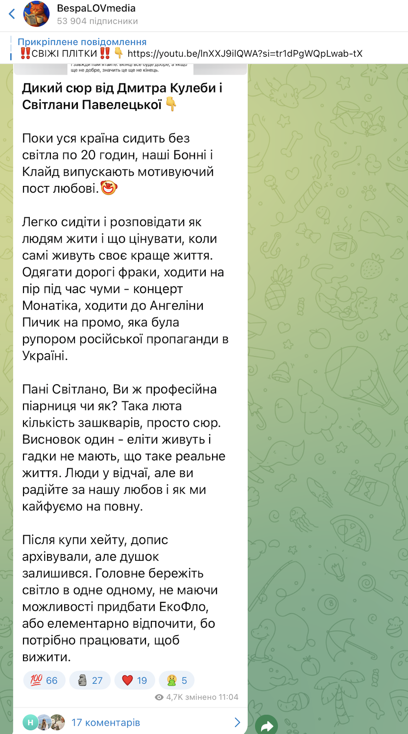 Также блогер обратился непосредственно к Светлане Павелецкой, поставив под сомнение ее профессионализм как пиарщицы и заявив о "большом количестве зашкваров". По его словам, после волны критики сообщение пары в Facebook было заархивировано. Однако в Instagram Кулебы сообщение все еще можно найти.