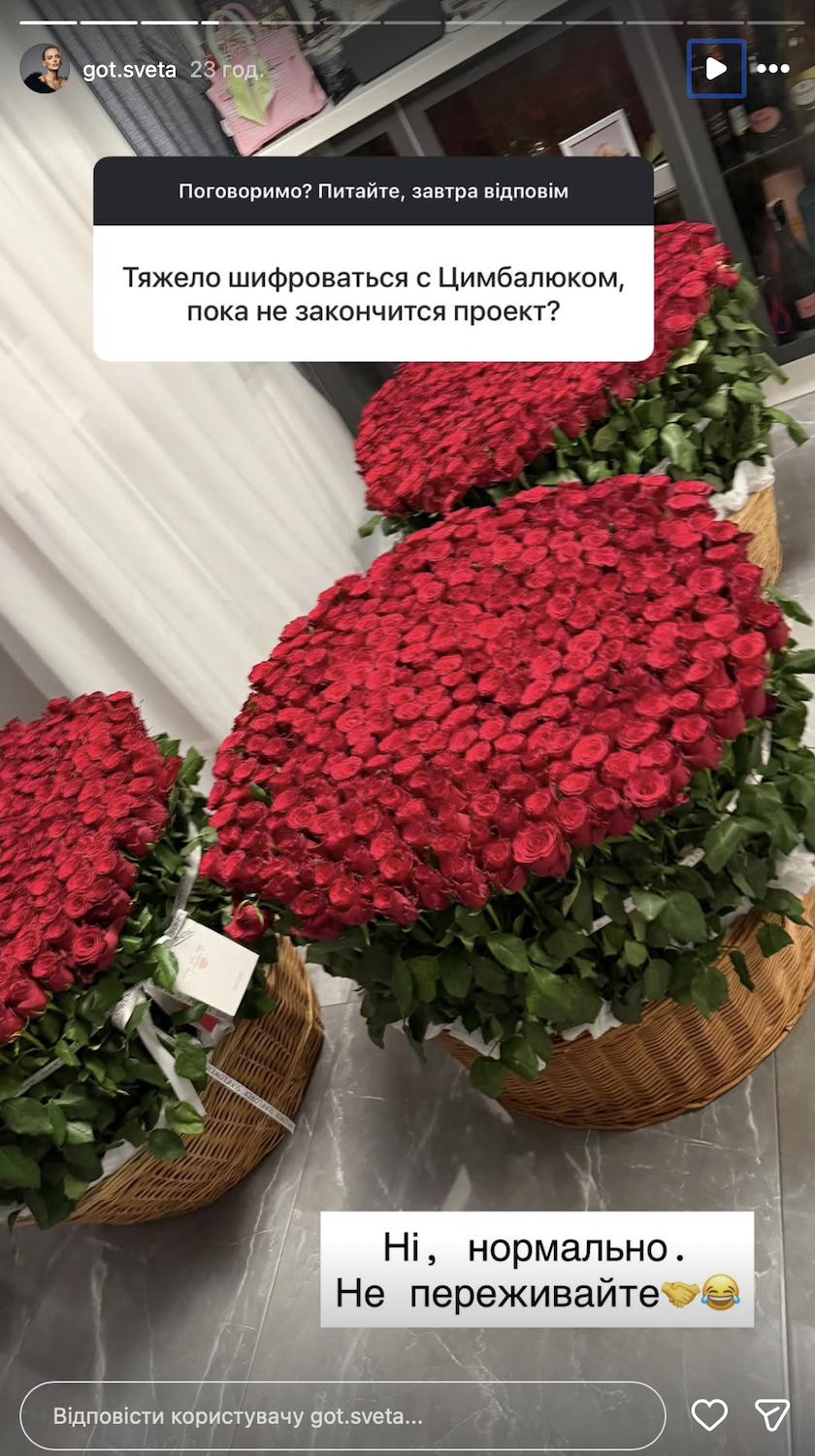 Отвечая на прямой вопрос одного из пользователей о том, тяжело ли ей "шифроваться" с Цимбалюком во время выхода романтического реалити, Светлана написала: "Нет, нормально. Не переживайте".
